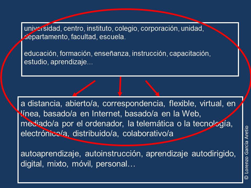 Las denominaciones que, según latitudes geográficas y épocas, se vinieron sucediendo fueron tales como éstas: Correspondence education, correspondence study, Fernunterricht, Fernstudium, Home study, Angeleitetes Selbststudium, Zaochny, Study withou leaving production, Guided didactic conversation, Two-way communication in distance, Independent study, Industrialized form of instruction, External studies, Flexible learning, Enseñanza semipresencial, Autoformación, Enseñanza o educación distribuida, Teleformación, Educación virtual (online), o formación en espacios virtuales, Sistemas inteligentes de enseñanza…
